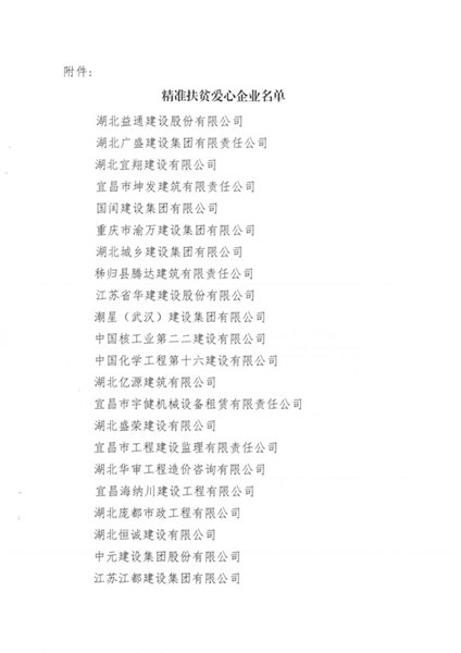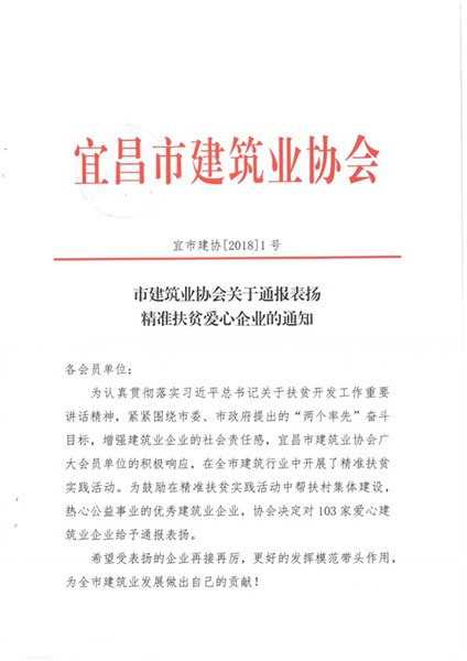 為了認真貫徹落實習近平總書記關於扶貧開發工作重要講話精神,2018年1月,在宜昌市建築業協會的號召下,緊緊圍繞市委、市政府提出的“兩個率先”奮鬥目標,公司參與了精準扶貧實踐活動。在此次活動中受到協會“愛心企業”表揚。幫扶村集體建設,熱心於公益事業,是公司的社會責任。把愛傳遞,是每個正天人的美德。