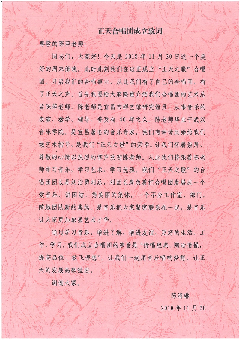 正天合唱團成立致詞